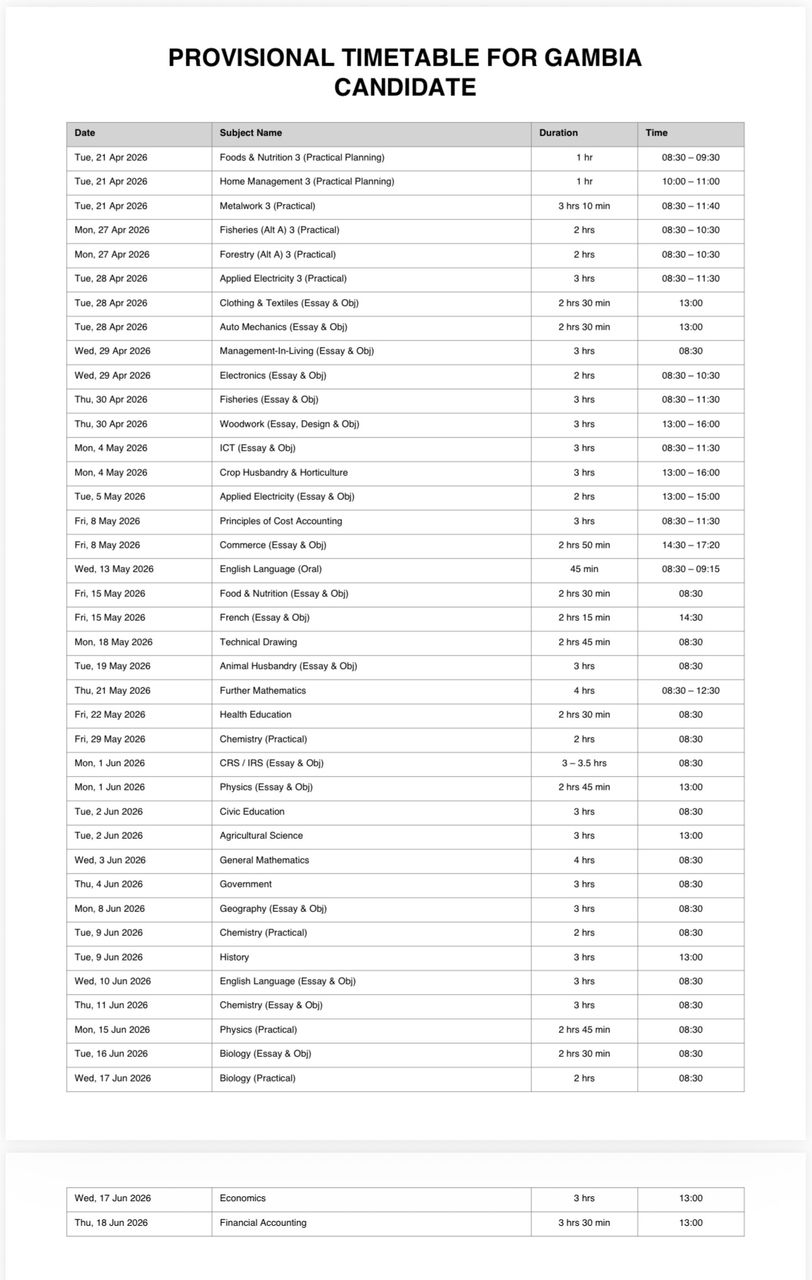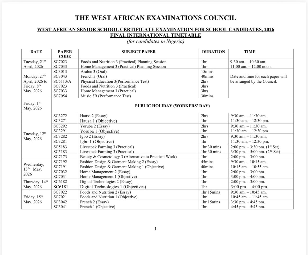 WAEC 2026 MAY/JUNE FINAL EXAMINATION TIMETABLE