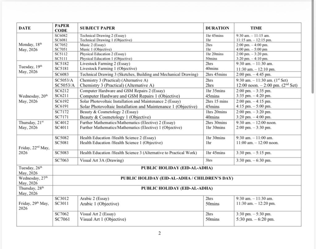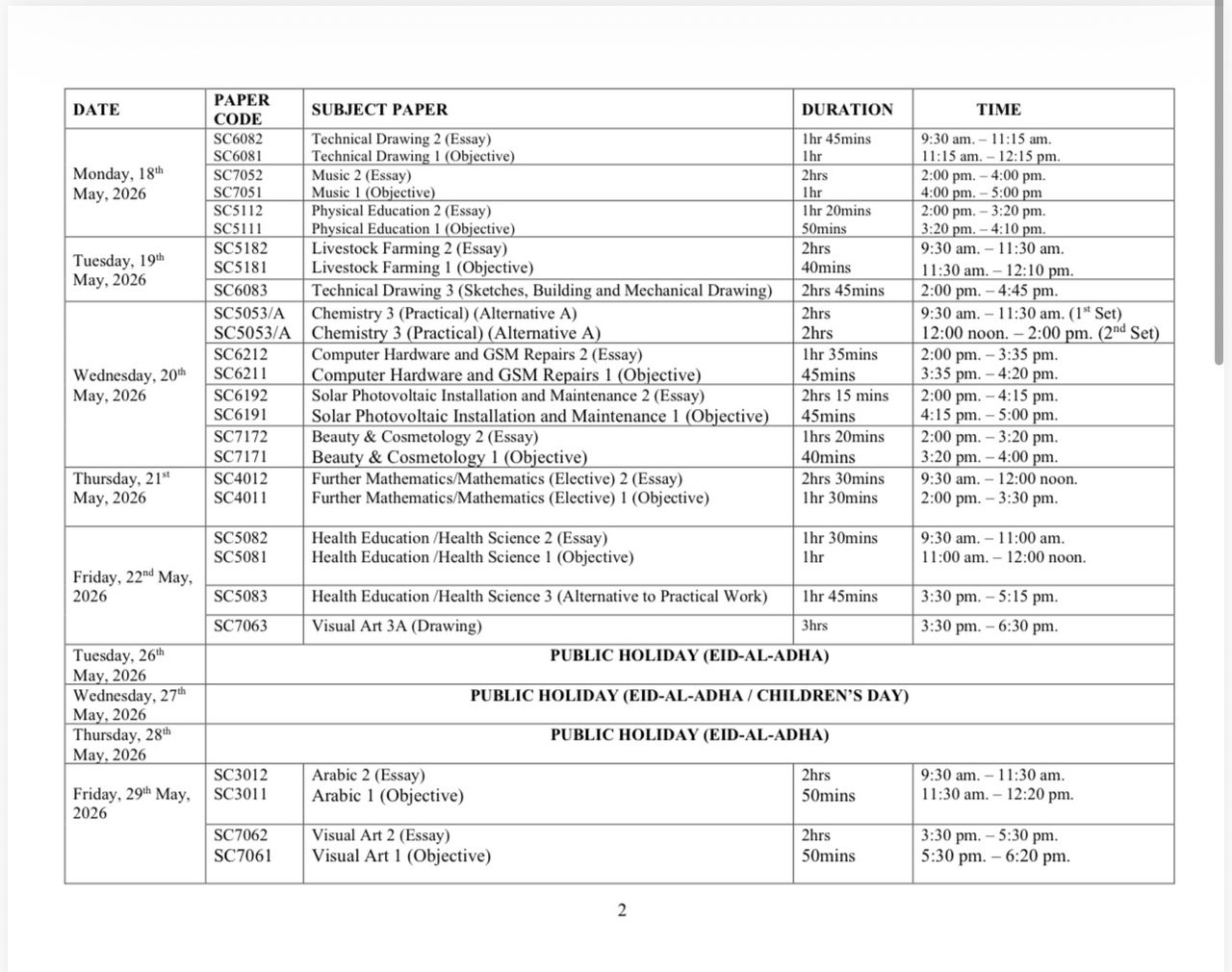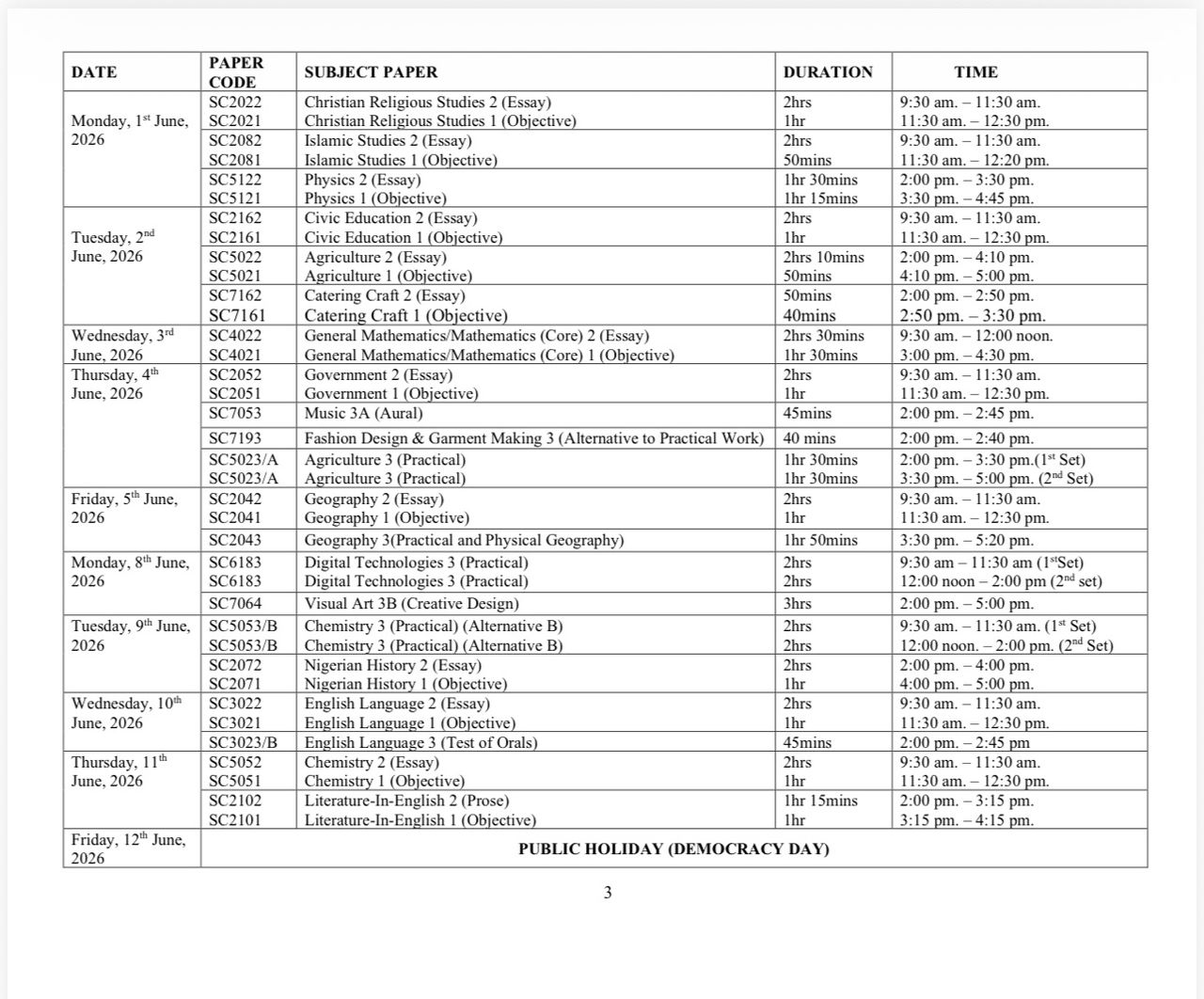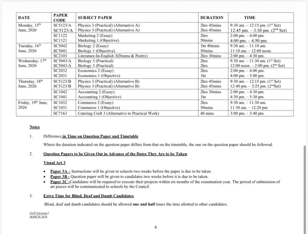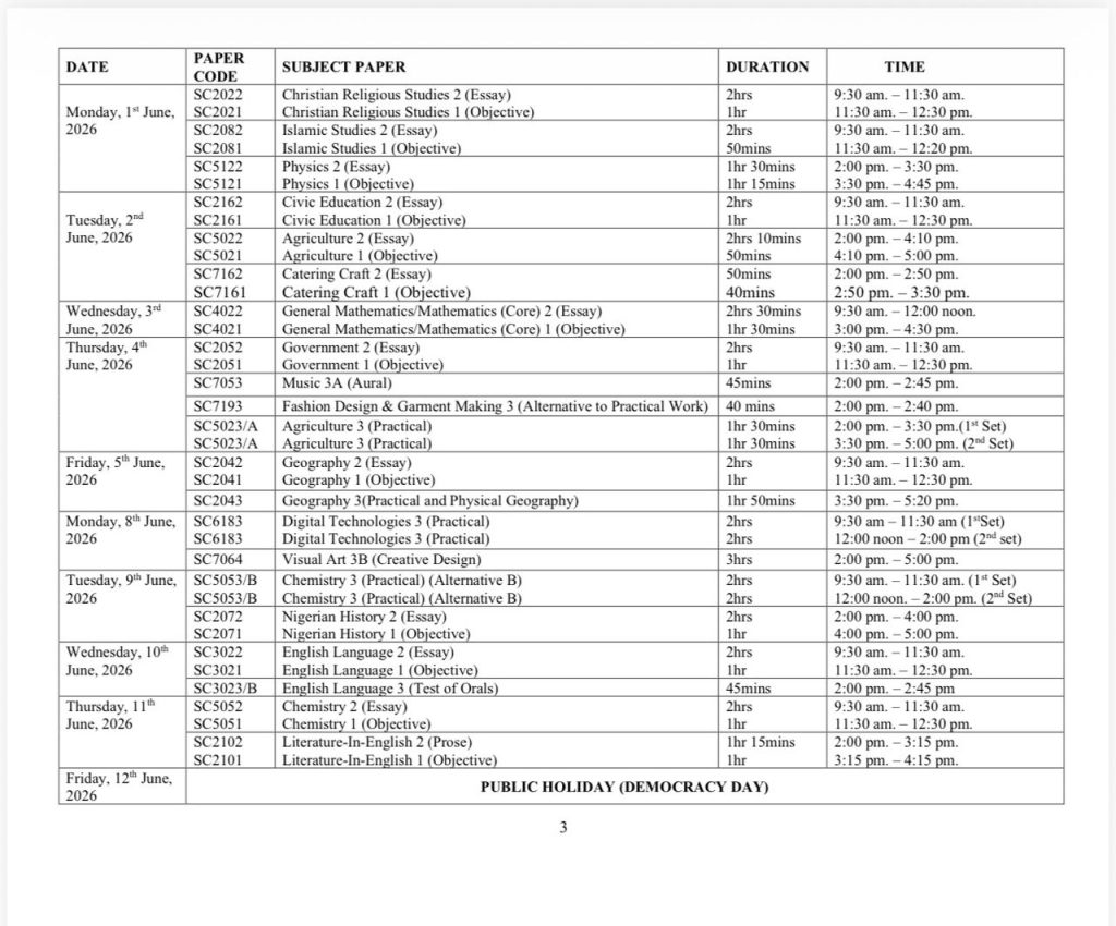 WAEC 2026 TIMETABLE | 2026 WAEC TIMETABLE